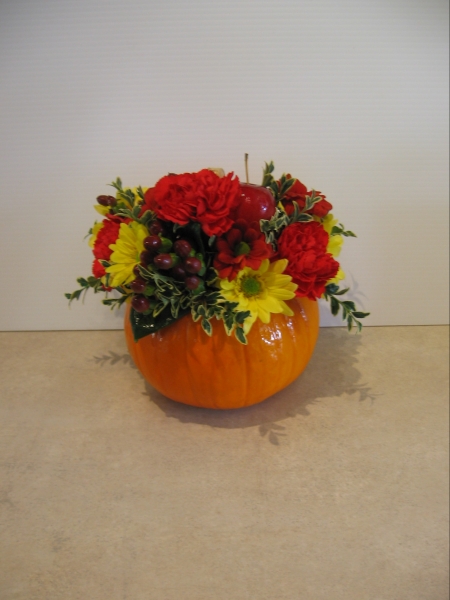 | | Une citrouille avec œillet rouge, marguerite jaune, pommette et hypericum. | Livraison gratuite sur commande en ligne |